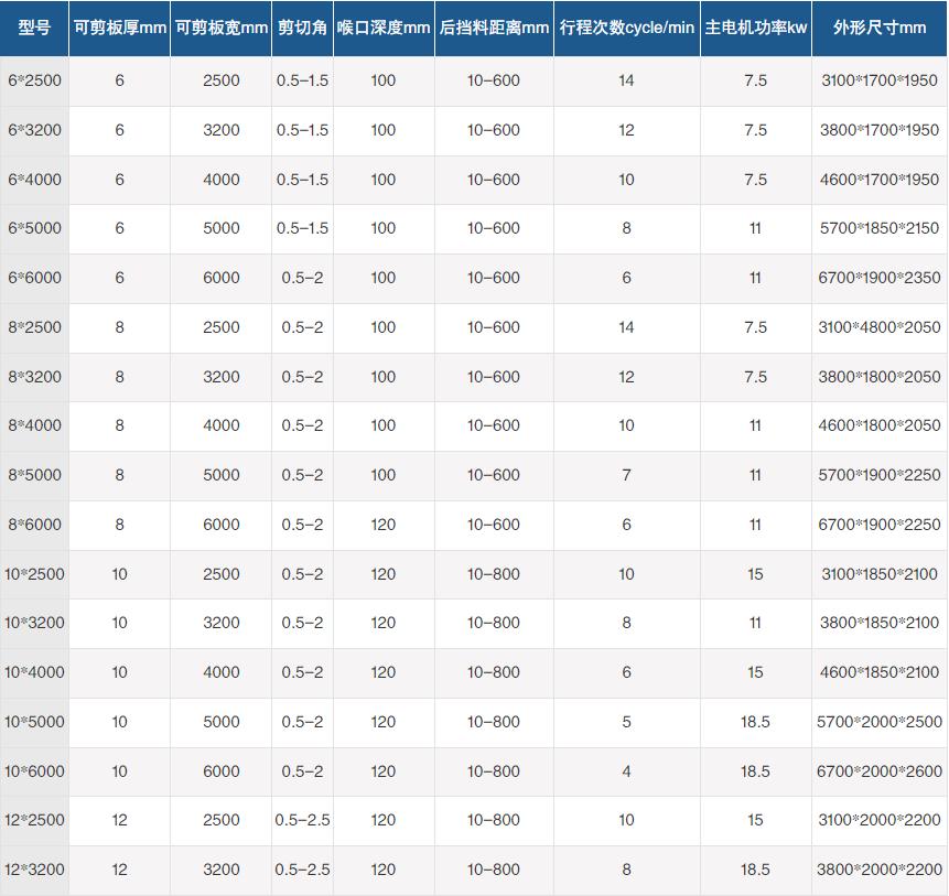 • QC11K数控液压闸式剪板机 主要用途和特征 ■ 第二代液压剪板机; ■ 采用钢板焊接结构,通过振动时效消除应力,有很好的刚性和稳定性; ■ 采用三点支承滚动导轨,消除支承间隙,提高剪切质量; ■ 刀片间隙用手轮调整、迅速、准确、方便; ■ 矩形刀片,四个刃口均可使用,使用寿命长; ■ 剪切角可调,减少板料扭曲变形; ■ 上刀架采用内倾结构,便于落料,并提高工件的精度; ■ 具有分段剪切功能,具有灯光对线的功能; ■ 机动后档料,数字显示; ■ 后托料装置(可另选择配置)。