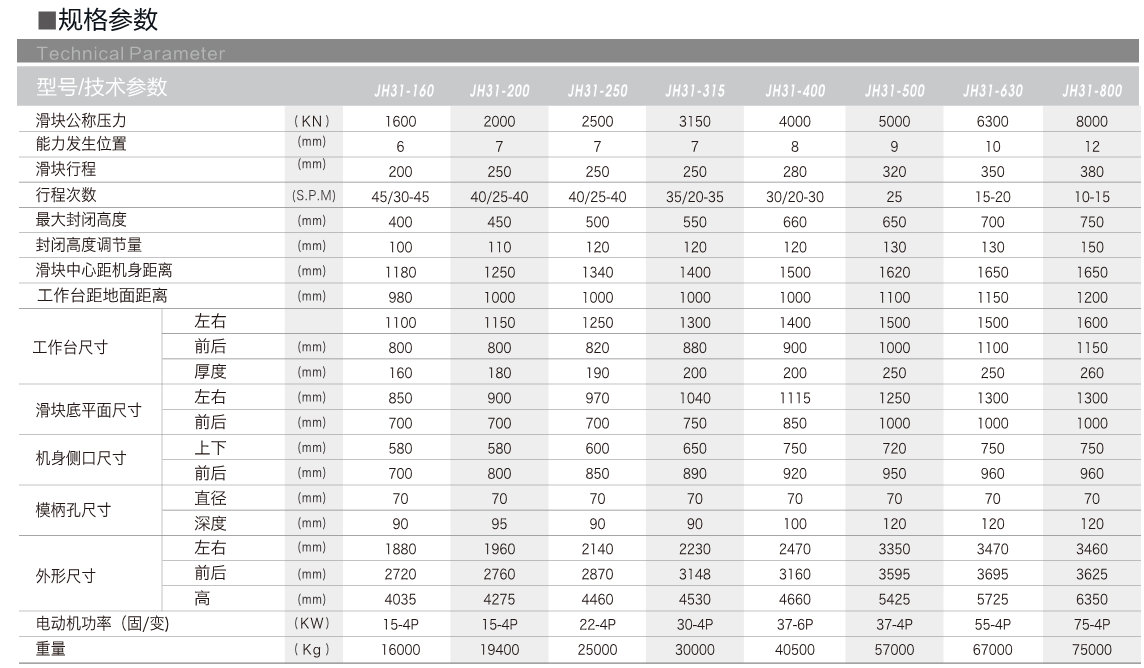• 产品特点  •整体焊接机身,前后对称,消除了开式压力机的角变形影响,提高了冲压精度模具价格寿命。  •采用干式或湿式气动摩擦离合制动器,动作灵敏可靠。  •大齿轮、齿轮轴精密研磨,机床运行噪音低,运行平稳。  •滑块六面导轨,250T以上采用8面导轨,精度高。  •本机型除定速外,有二种无极变速行程选择,更适合冲压件工艺要求和提高生产效率。 •采用液压超负荷保护装置,有效保护压力机和模具。