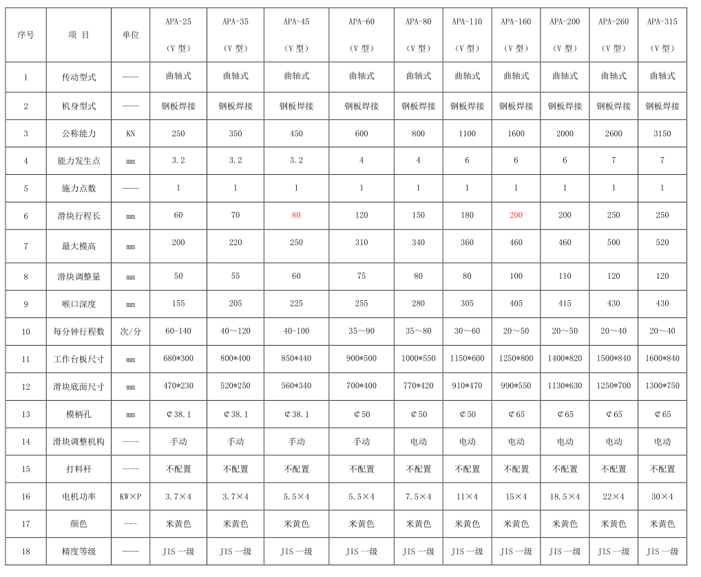 • 主要结构特点和方式 1 采用主驱动方式 2 传动形式:曲轴式传动;直齿轮啮合 3 机身导轨采用六面导向 4 采用正板焊接制成压力机台身 5 离合器采用干式,离合器和制动器系统合成一体。 6机身采用Q235-B焊接结构,焊接后进行回火处理,消除材质内应力。台身与导轨间采用六面导向。 电气部分 电气采用PLC控制,配备有功能强大的人机界面,使用知名品牌的触摸屏做为显示,置于主操作面板上,可实现以下功能: 1 触摸屏汉字显示,简单易懂,显示压力机的各种数据参数,比如行程次数、电子凸轮角度等,且还可以通过触摸屏进行相应数据的设定; 2 显示压力机的工作流程,使操作者更加便捷地操控压力机,且设有主要流程的状态指示; 3 操作和故障信息显示,使操作者和维护者更加快捷地解决压机出现的问题,减少停机的时间; 4 PLC输入/输出点的实时监控功能; 5 设置产品计数画面,可以实时显示当前的产品计数,同时也可以设置目标工件数。
